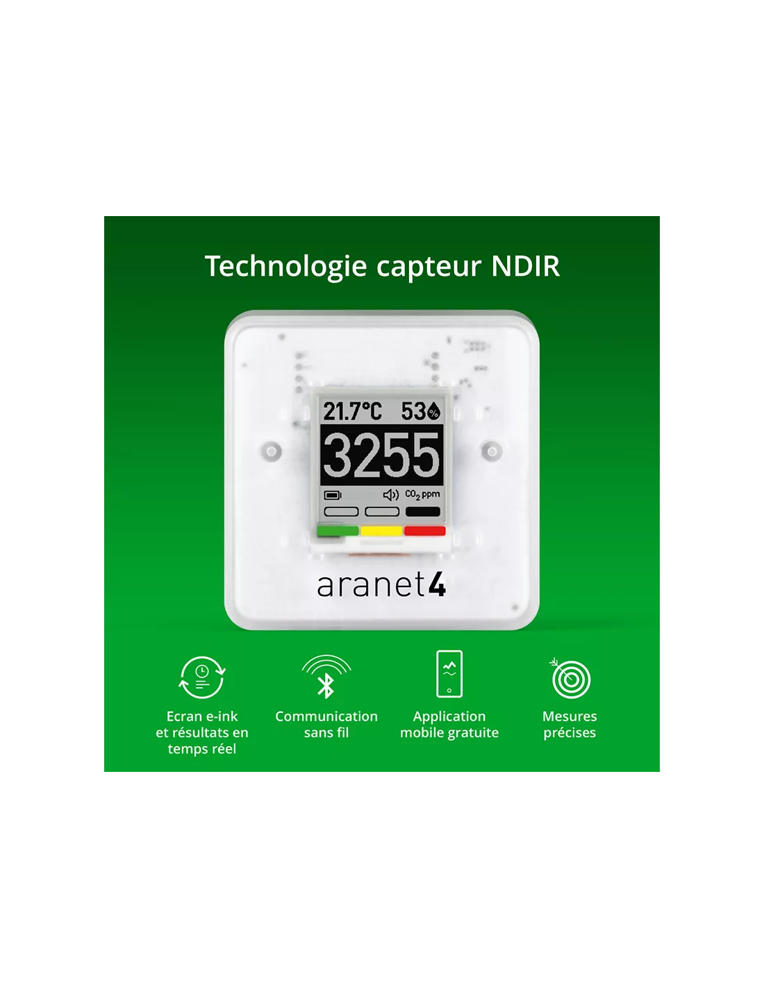 Il est adapté pour surveiller le niveau de CO2 à la maison, à l’école, au bureau ou tout autre environnement intérieur (par exemple tous les ERP – établissement recevant du public). L’indicateur Aranet4 HOME fonctionne sur piles avec une autonomie pouvant aller jusqu’à 4 années.