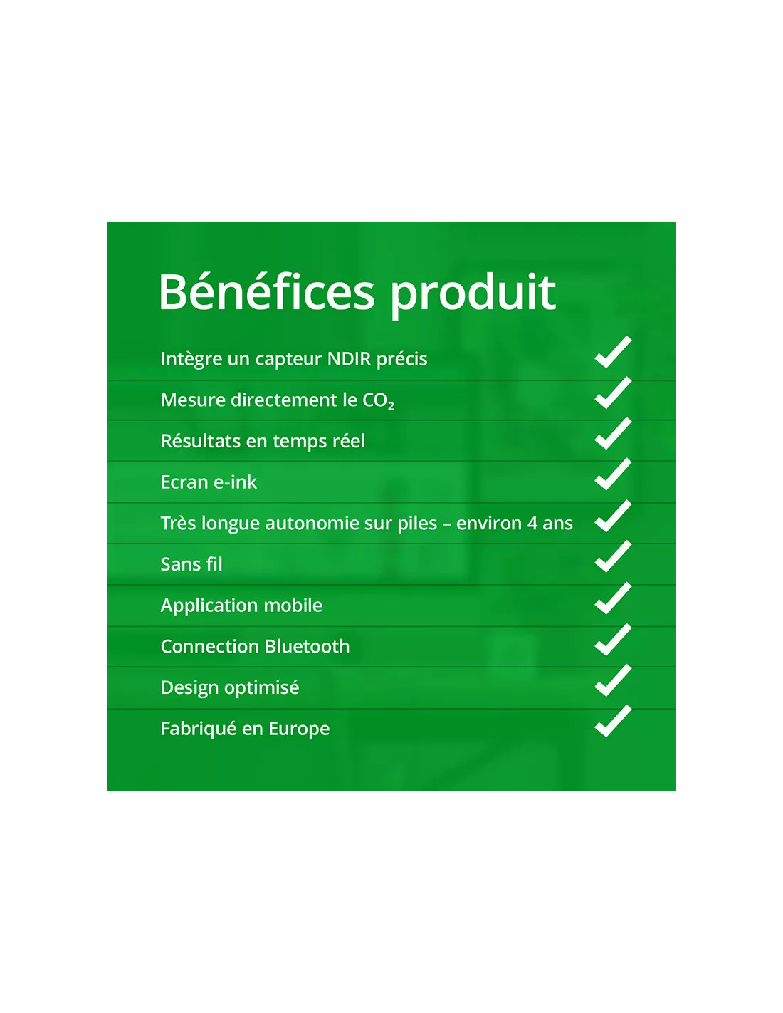 Il mesure et enregistre les données de votre environnement intérieur. Ces données sont accessibles en temps réel via l’affichage à encre électronique e-link ou via une application smartphone et tablette (IOS et Android).