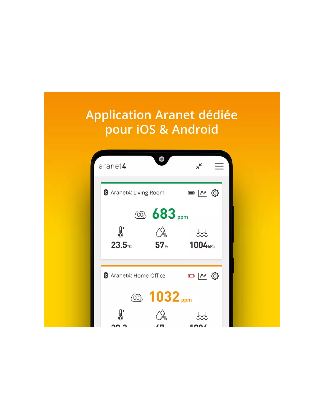 L’application Aranet4, permet d’accéder sans fil aux données en temps réel et de visualiser jusqu’à une semaine d’historique de données. Elle prend en charge la connexion à plusieurs capteurs Aranet4 HOME pour surveiller leurs paramètres à distance à partir d’un seul téléphone ou tablette.