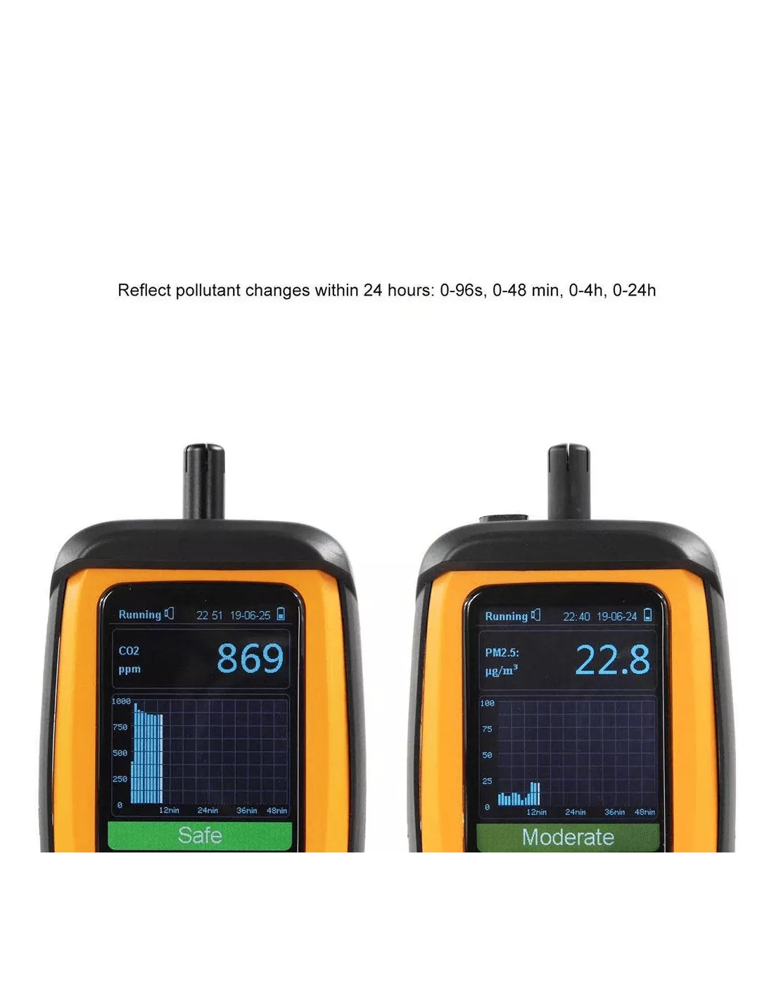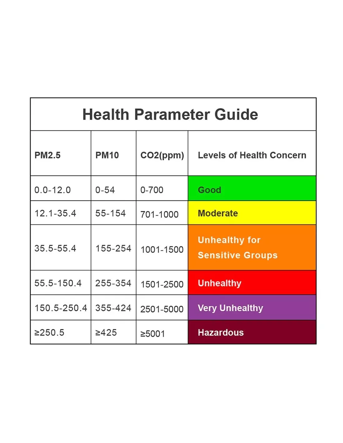 - PM2.5 : 0 à 999 µg/m³(résolution 0,1ug/m³)