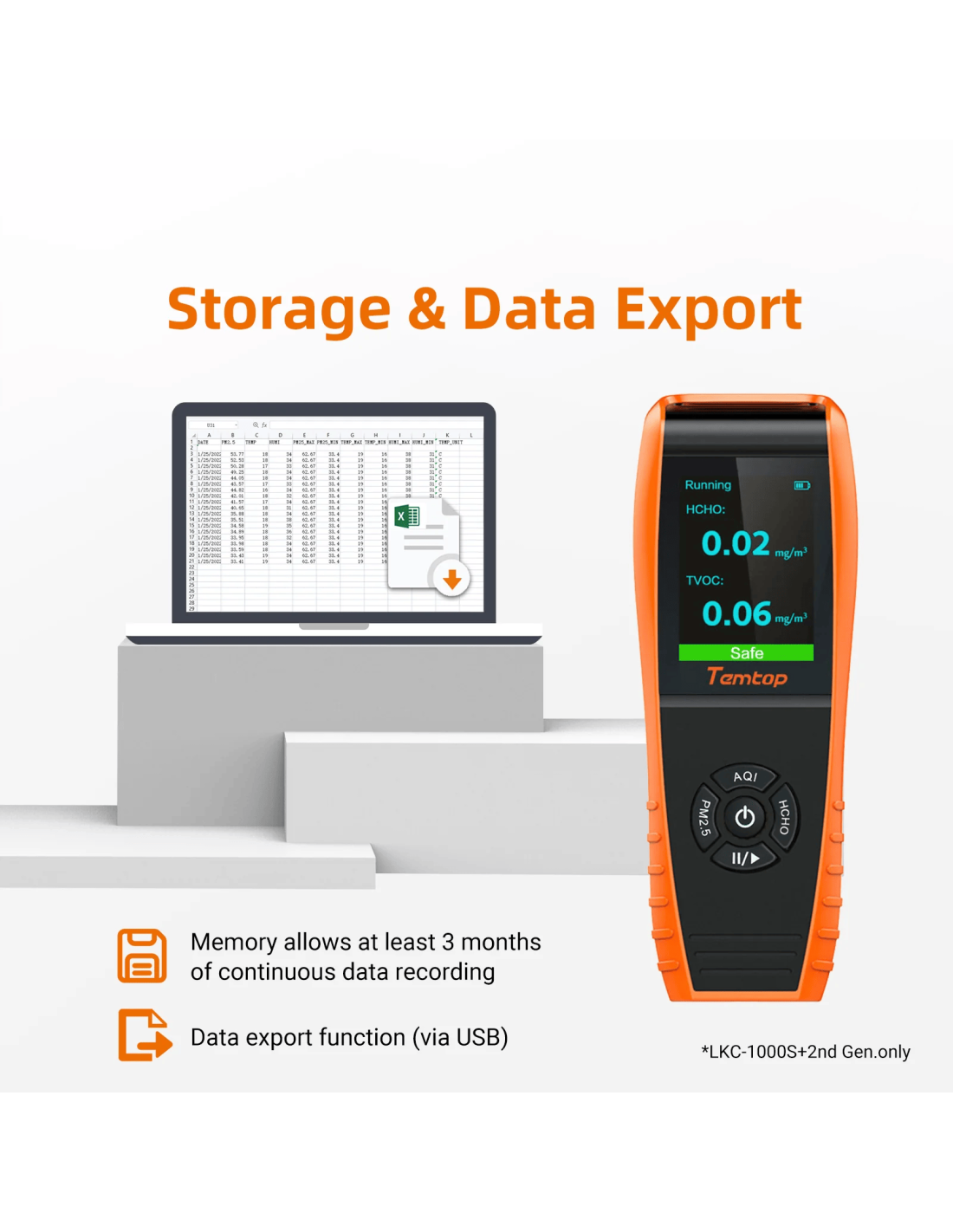 Le LKC-1000S+ 2ème génération est un portable de mesure de la qualité de l'air intérieur qui permet de surveiller avec précision plusieurs paramètres essentiels tels que les PM2.5, PM10, CO2, HCHO (formaldéhyde) et TVOC (composés organiques volatils totaux), AQI (Air Quality Index), température et humidité, avec exportation des données.