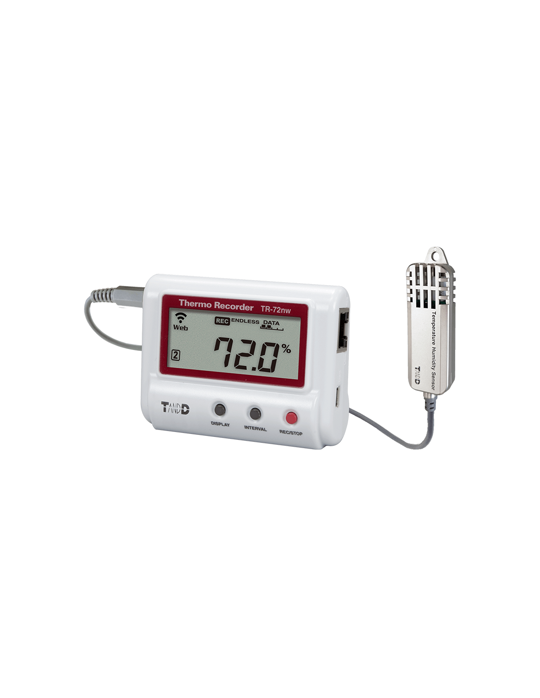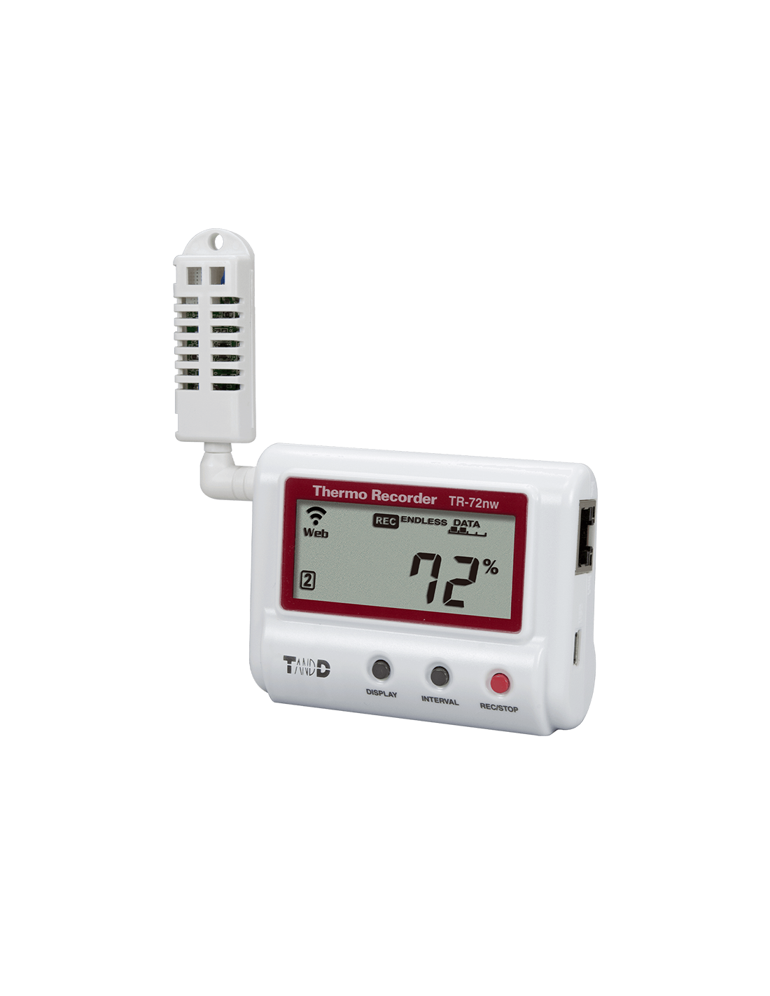 Le TR-72nw-S est un enregistreur de température et d’humidité relative (utilisé lors du stockage d'articles délicats). La connexion Ethernet permet de télécharger les données sur le cloud afin d'y accéder à tout moment. Le capteur peut se connecter à un PC à l'aide d'un câble USB pour télécharger les données enregistrées, créer des rapports et modifier les paramètres.
