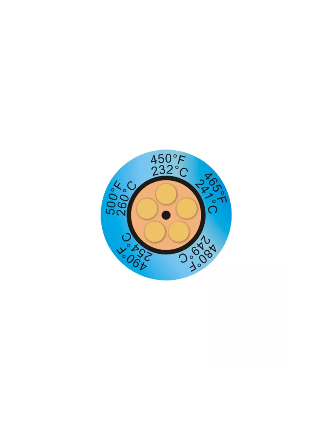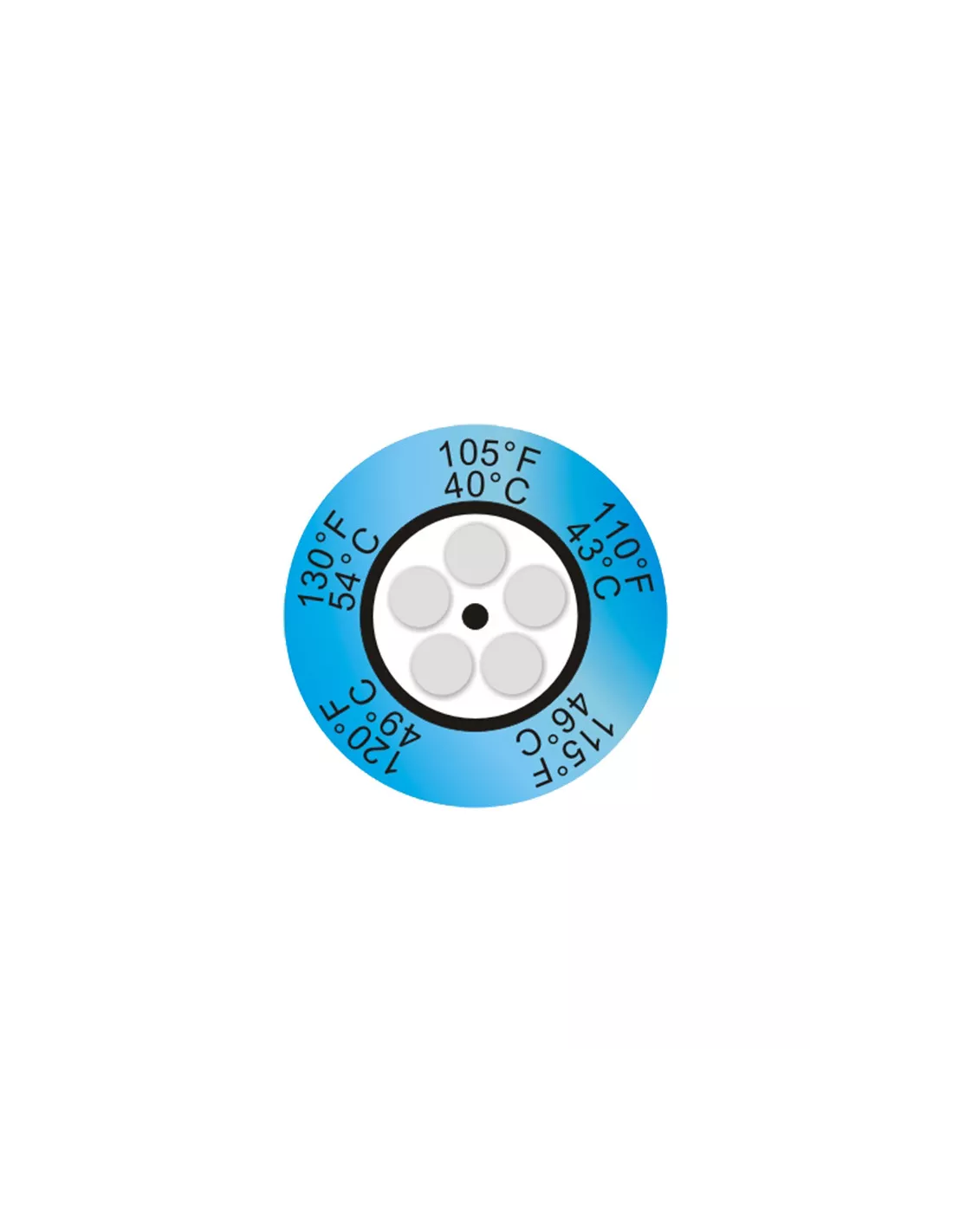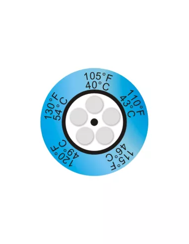 La pastille irréversible thermosensible Clock Thermax à 5 températures se présente sous la forme d'une étiquette ronde autocollante. Chaque étiquette possède plusieurs paliers et change de couleur lorsque la température maximale est atteinte, celle-ci est alors mémorisée. La pastille thermomètre 5 températures possède 8 séries de 40°C à 260°C.
