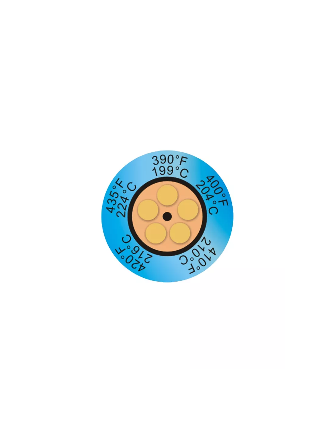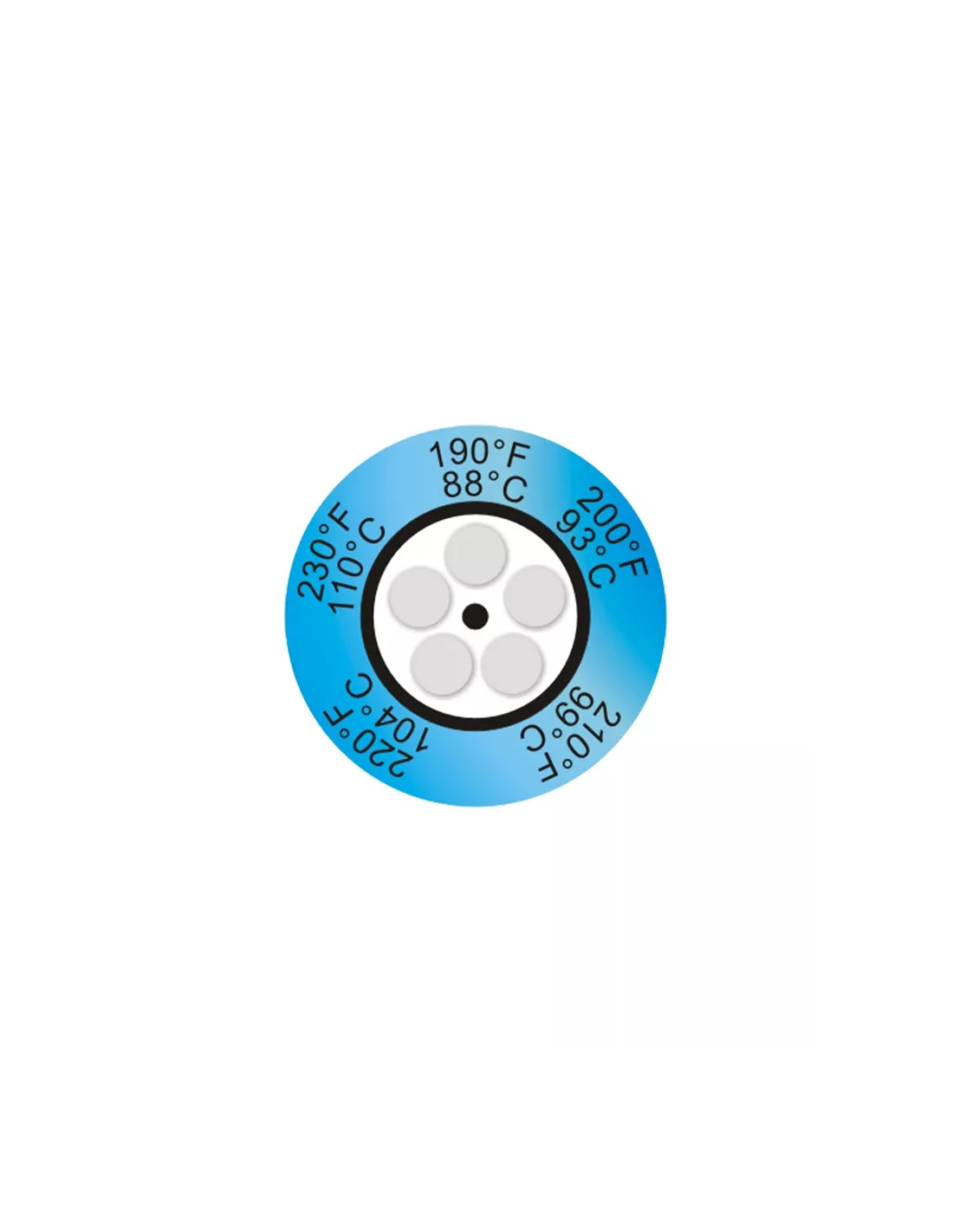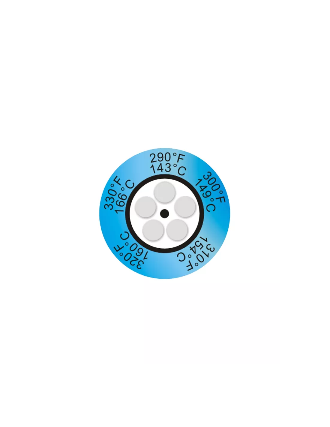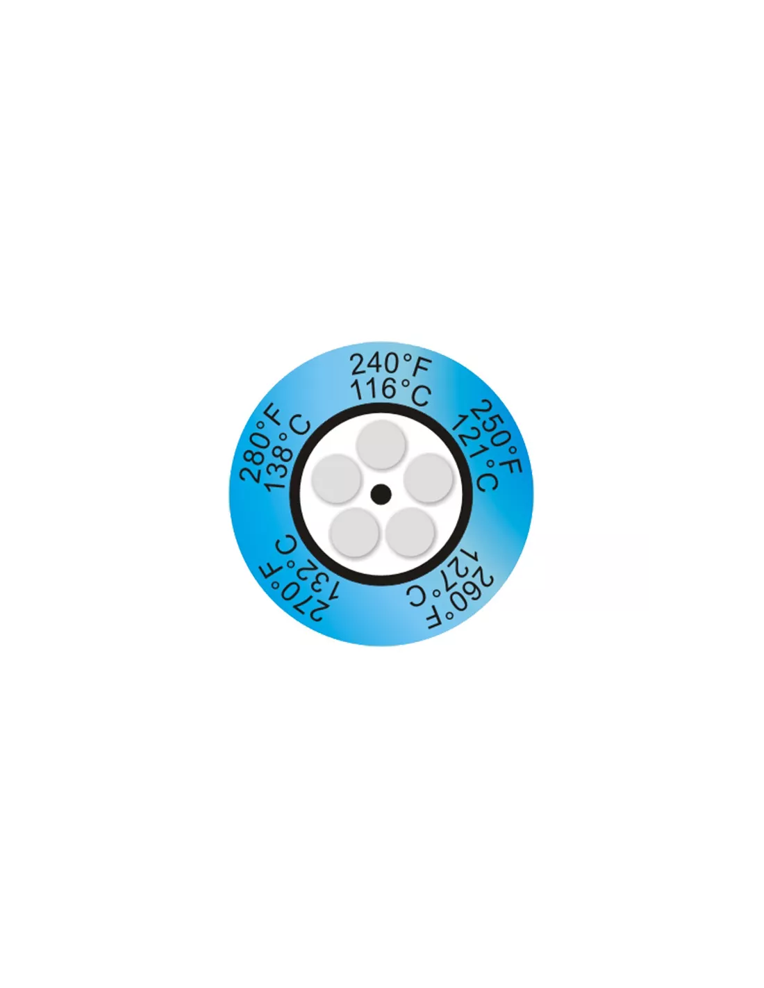 L'indicateur thermosensible Clock se présente sous forme de pastille ronde adhésive de 14 mm de diamètre sur laquelle est affichée 5 paliers pour le contrôle de température dans une gamme de 40°C à 260°C.