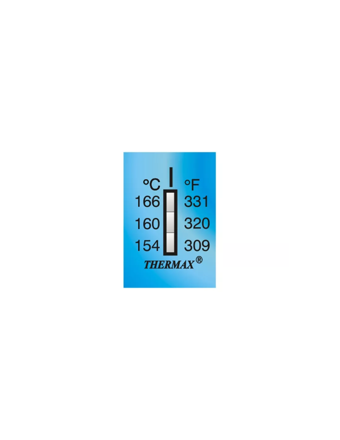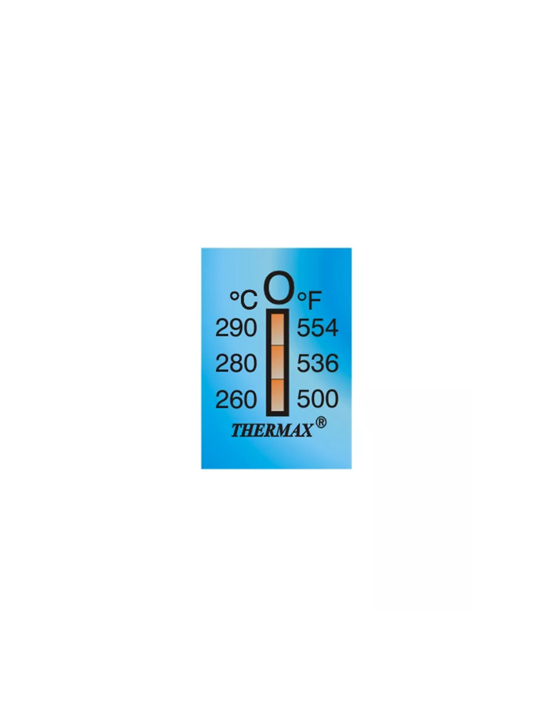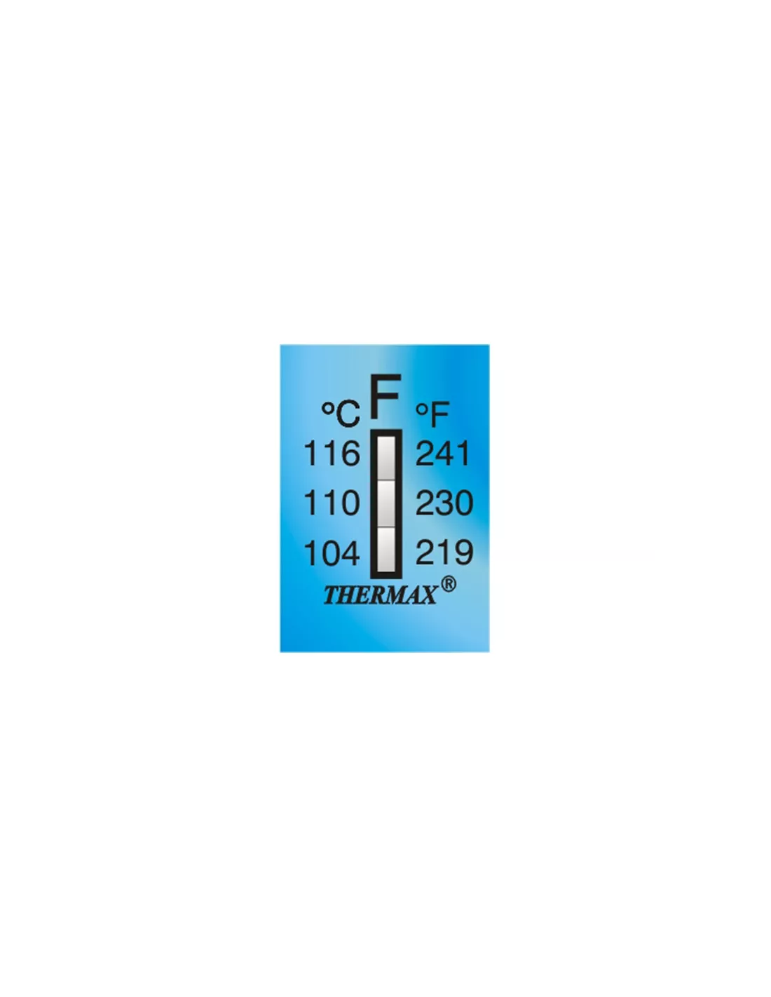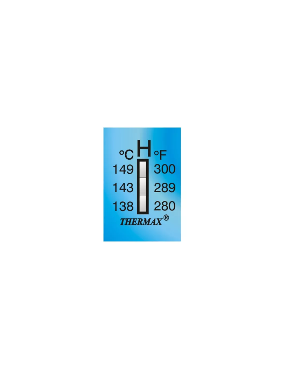 Les rubans irréversibles thermosensibles à 3 températures THERMAX se présentent sous forme d'étiquettes autocollantes verticales. Lorsqu'un palier est atteint, il change de couleur de manière irréversible. Le ruban thermomètre possède 16 gammes de +29°C à +290°C et 3 paliers de température. Conditionnement : 1 carnet contient 10 rubans indicateurs Commande minimale : 100 carnets