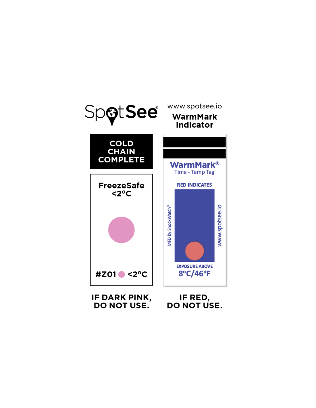 L’indicateur Cold Chain Complete combine deux indicateurs de température afin d’alerter les utilisateurs en cas d'exposition à des températures non recommandées.